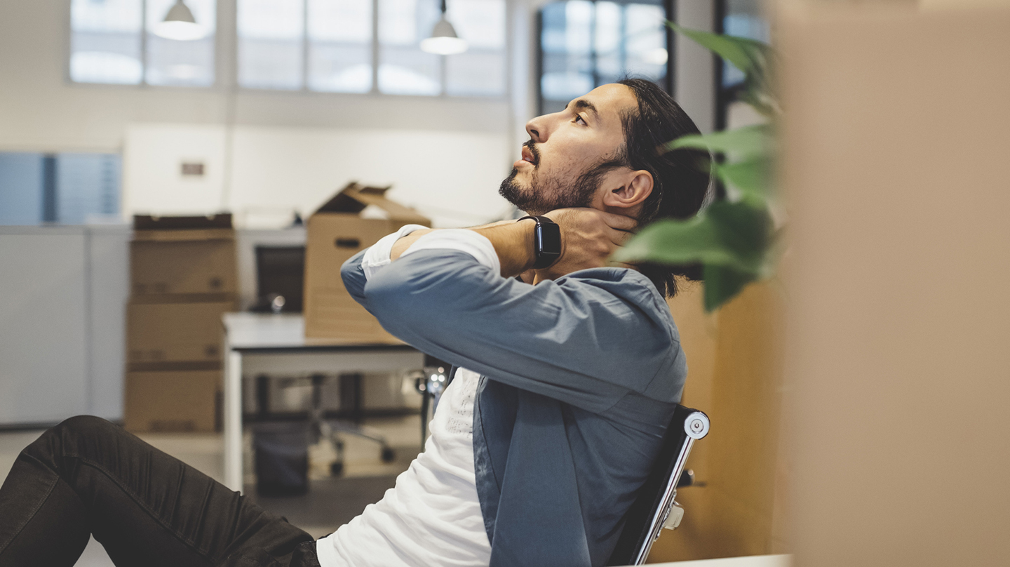 Die Verspannung im Nacken massiert sich ein junger Mann, der auf einem Bürostuhl sitzt, einfach weg |